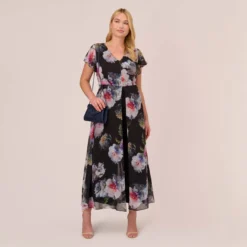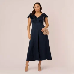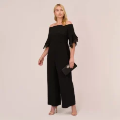 Adrianna Papell Plus Size Off The Shoulder Crepe Jumpsuit With Organza Sleeves In Navy Sateen