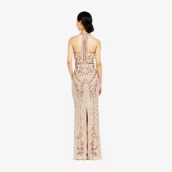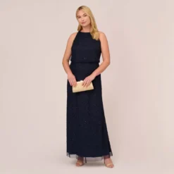 Adrianna Papell Plus Size Art Deco Beaded Blouson Dress With Halter Neckline In Navy Black