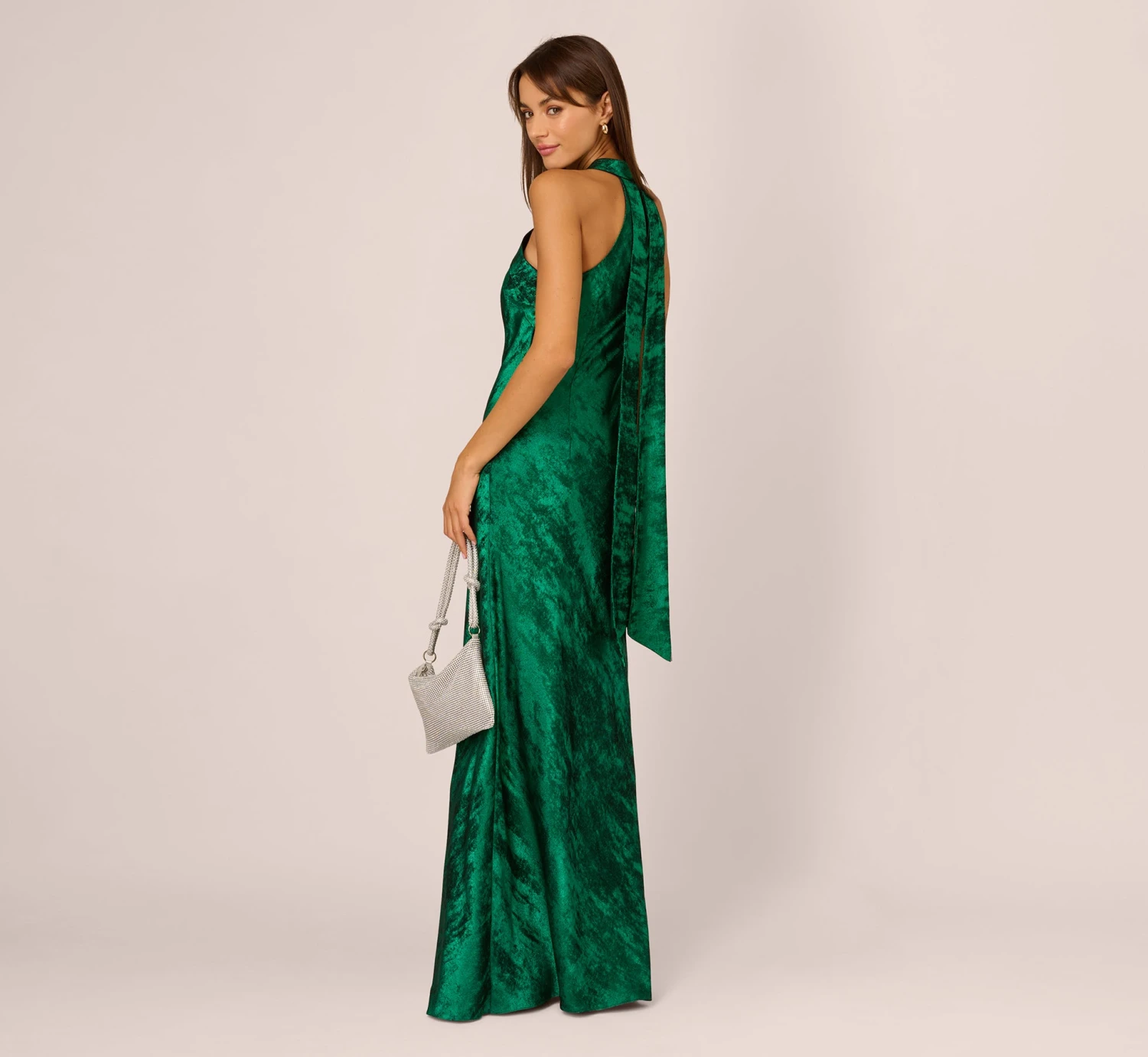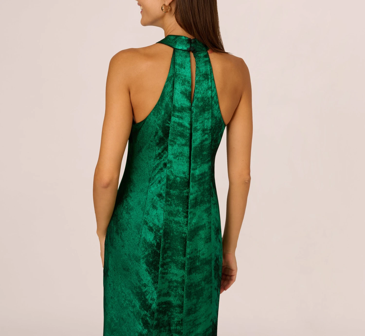 Be the star of the show in our glamorous halter dress fashioned from a sleek metallic foiled crepe de chine. This striking dress hugs your curves before ending at the mermaid hemline. Finished with a dramatic self-tie back and sleek back zipper with hook-and-eye closure. Make a stunning statement at your next formal affair.