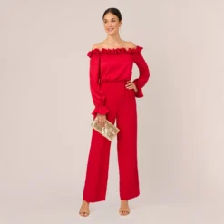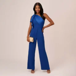 Adrianna Papell Satin Crepe Three Quarter Sleeve Jumpsuit With Buckle Waist In Dark Navy