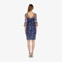 Adrianna Papell Floral Embroidered Illusion Short Sheath Dress With Bell Sleeves In Black Multi