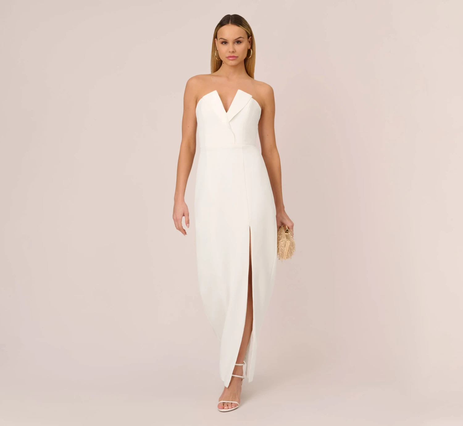 Streamlined and sexy, with elegant satin notches and a flowing floor-length skirt. Accented with a sculptural, modern neckline and chic slit at the front.