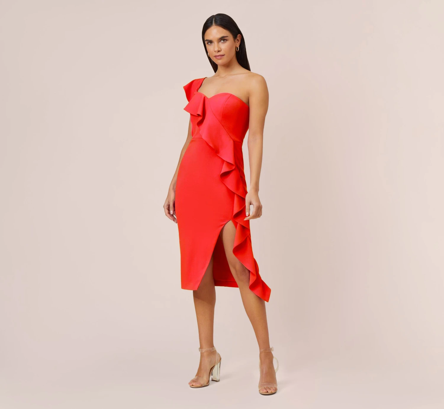 Made from a luxe stretch knit crepe fabric, this strapless sheath dress is designed with classic lines and a flirty ruffled accent to create a flattering and feminine silhouette. This stunning party dress features an adjustable single ruffled shoulder sleeve that can be worn on or off the shoulder and a feminine sweetheart neckline. The midi sheath skirt is complete with a slit for ease of movement. Back zipper with hook and eye closure. Amp up your look at prom, wedding receptions and any upcoming party on your calendar.